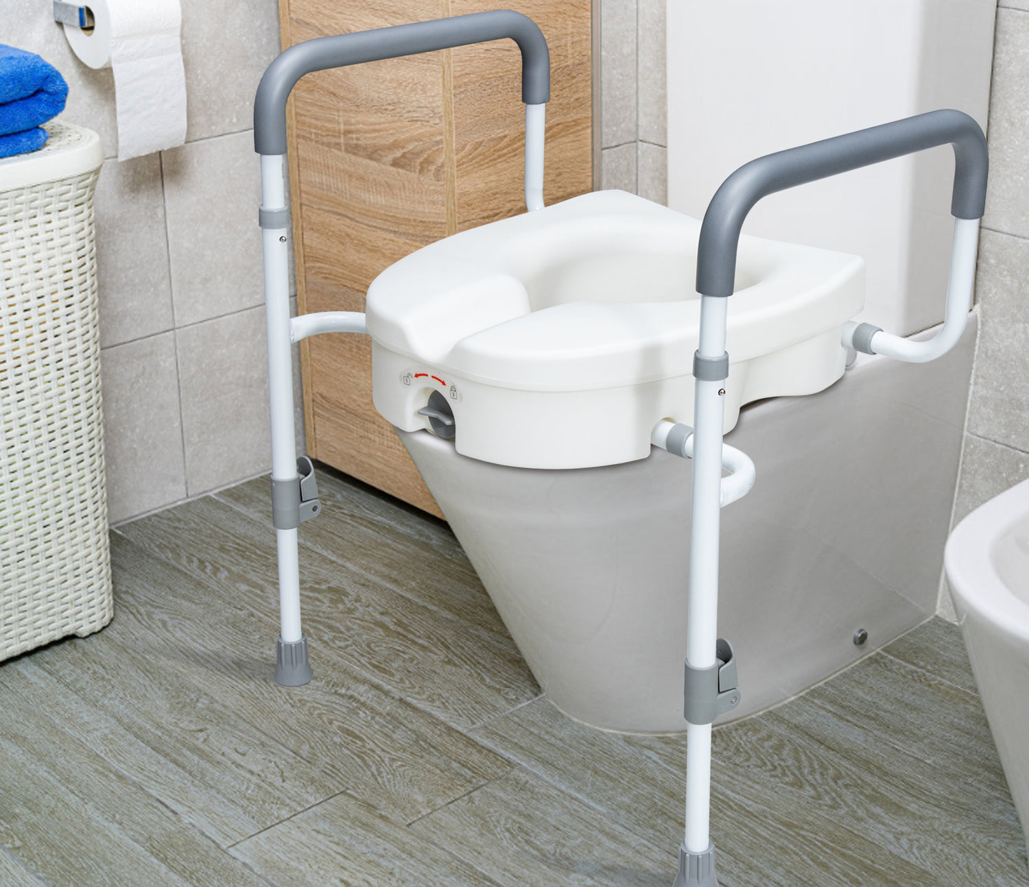 The raised toilet seat adds 5 inches of height to your toilet seat and features safety grab bars to make it easier and safer to sit or stand.