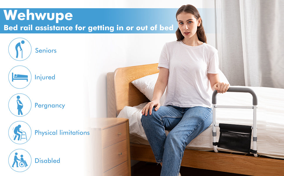 - SUPPORT SAFETY: WeHwupe compact bed rail is great for seniors,prevent Seniors from falling down.bold frame is more stable can hold up to 350lbs, Assistance the elderly to get in and out of bed safely.