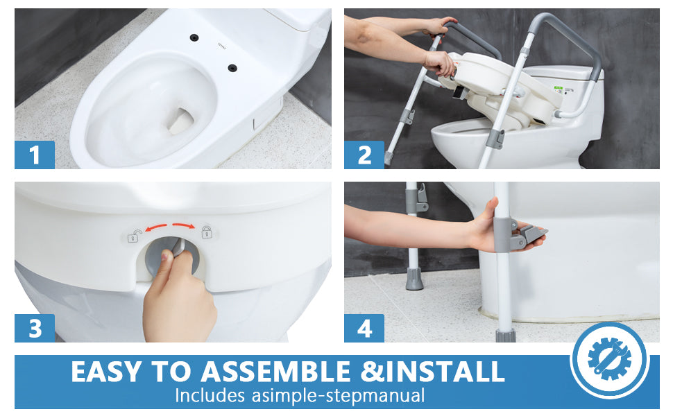 SIMPLE ASSEMBLY AND USE:Easily assembled in minutes without tools.The handle of the toilet seat is padded with soft, non-slip foam for a comfortable and secure grip. The handle and seat are also easy to clean, simply wipe with a damp cloth.